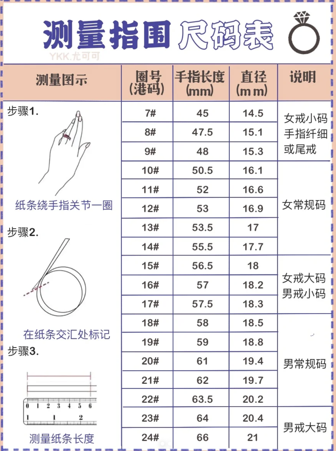 6. **戒指的样式**: 不同的戒指样式可能会影响舒适度和尺寸选择,特别是有大面宝石或复杂设计的戒指可能需要更大的尺寸以避免压迫手指。 😘按照这些注意事项进行测量,可以帮助你更准确地确定合适的戒指尺寸。
