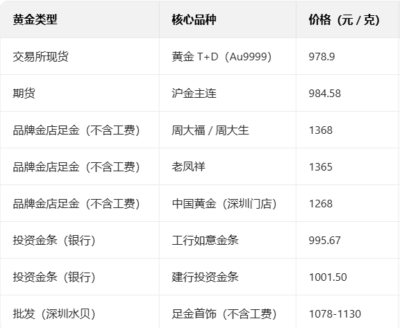 今日国内基础金价整体呈现上涨态势,主流金店报价基本集中在974~979元/克区间。
